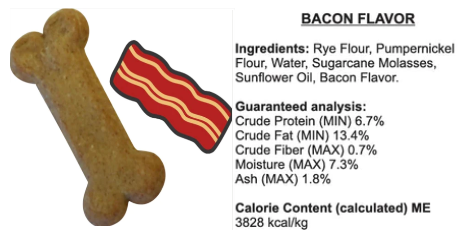 BACON: Rye Flour, Water, Sugarcane Molasses, Canola Oil, Bacon Flavor.